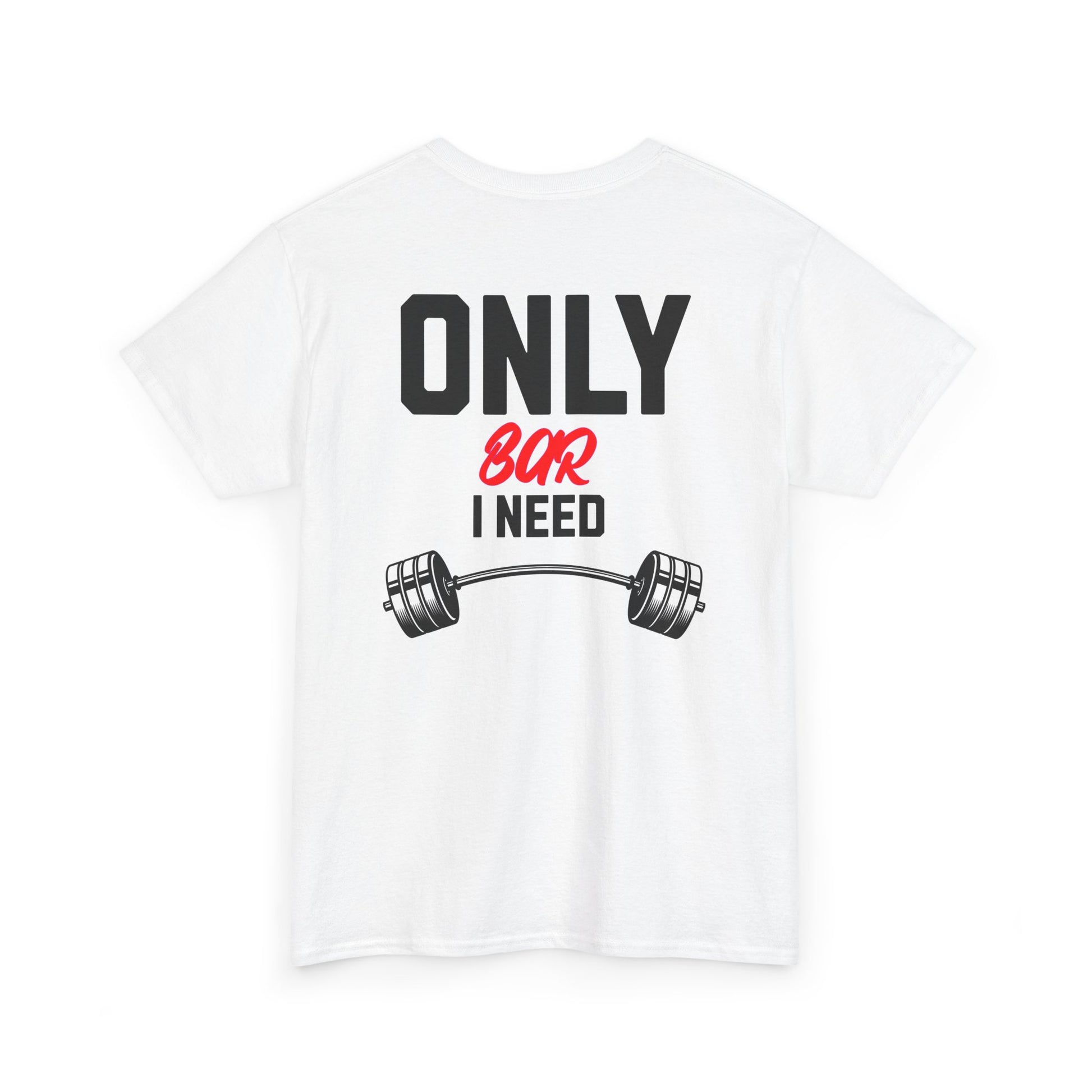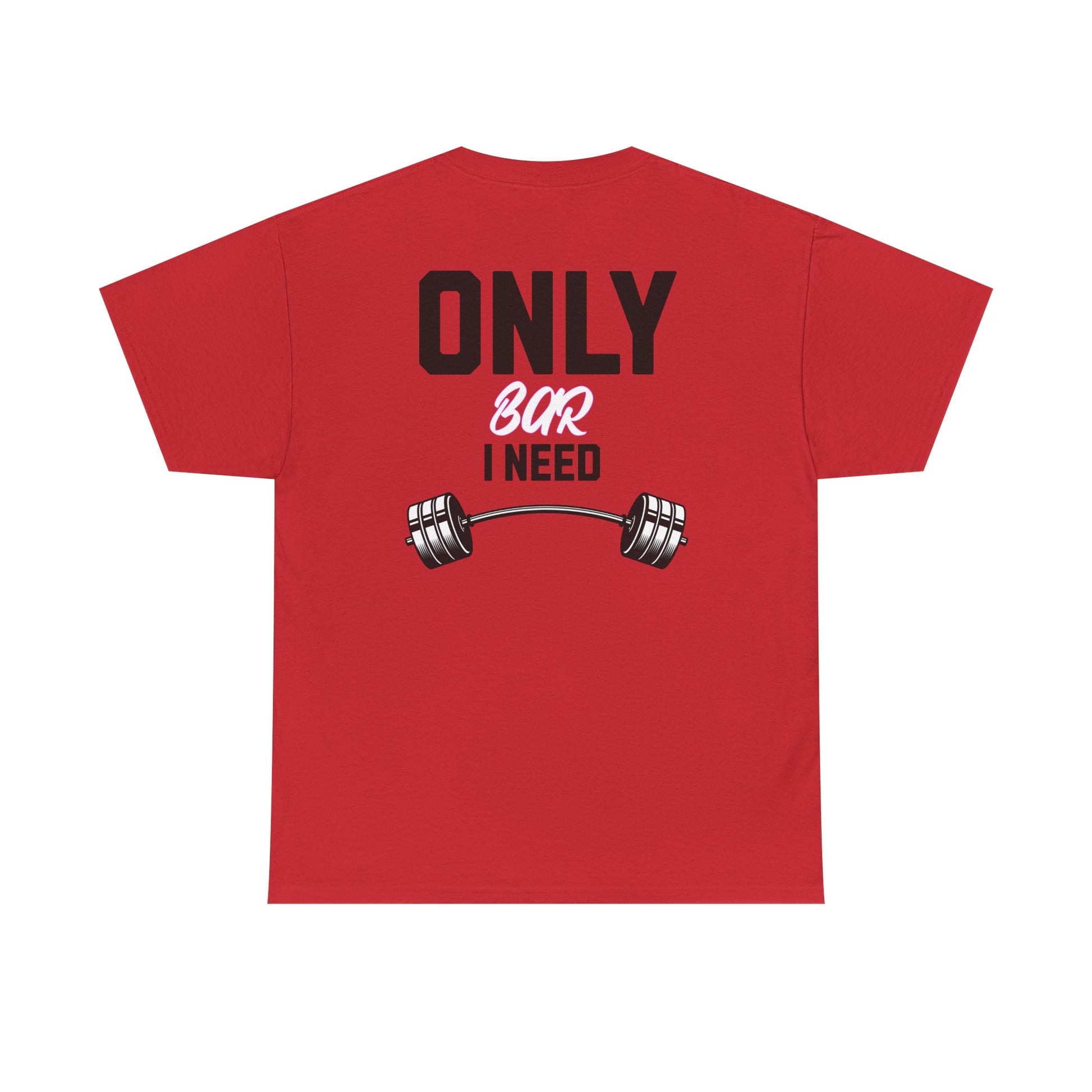 Shirt for people who love to workout. Available in black white or red color. Crisp, clean, and built for movement — this classic crew tee wears like your go-to gym shirt but looks good enough for errands and coffee afterward. The bold back design reads “ONLY BAR I NEED” above a heavy barbell graphic, a simple declaration for people who live by the lift. The midweight 100% cotton body has a smooth hand and a ribbed collar that keeps its shape through repeats at the bar. Tubular knit construction and shoulder tape add structure so it holds up to heavy use. Lightweight care, breathable comfort, and tear-away labeling make it easy to wear from warmups to cool-downs. This tee lands best with lifters who favor straightforward, no-frills gear that speaks to their routine and mindset.
